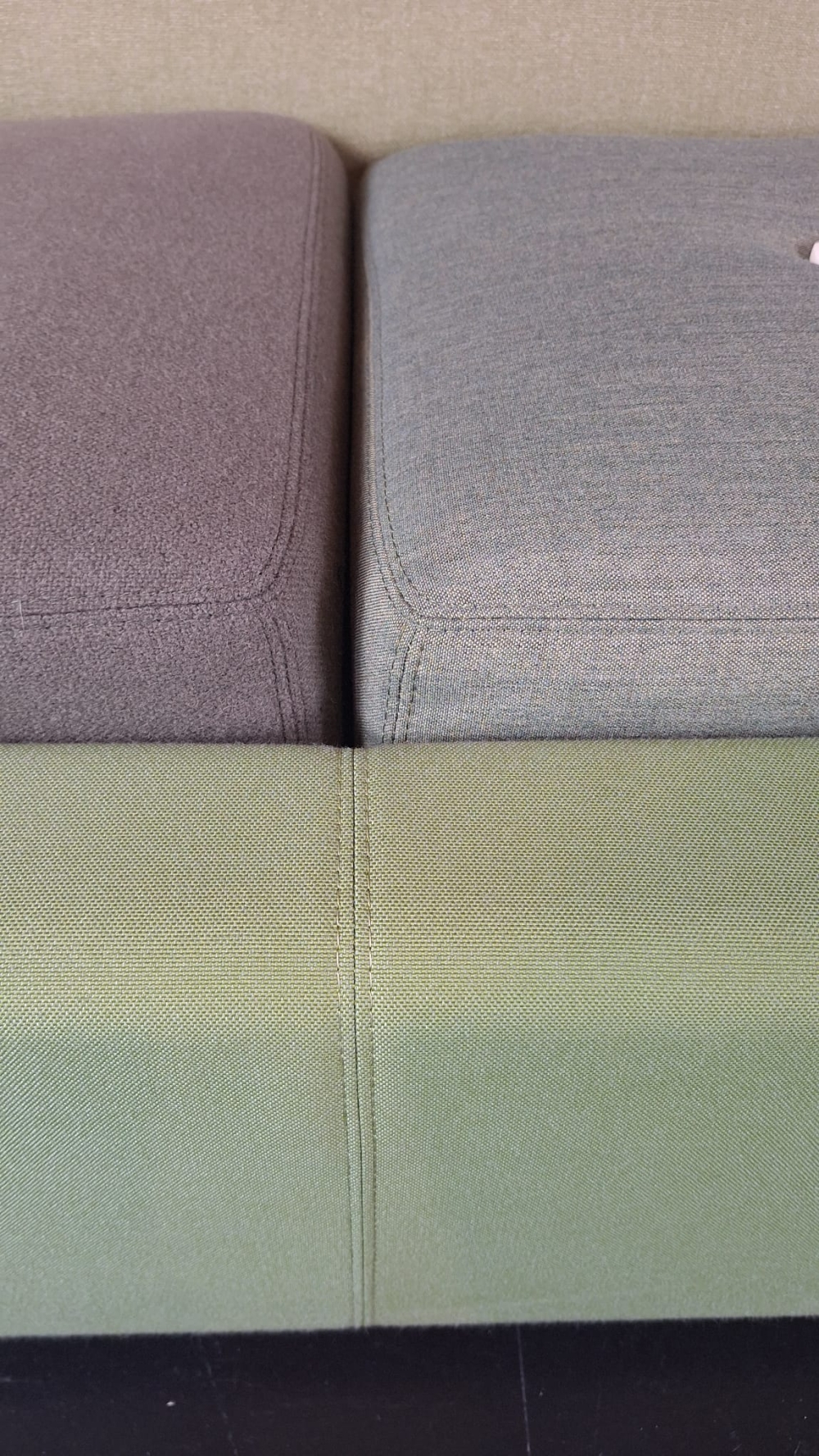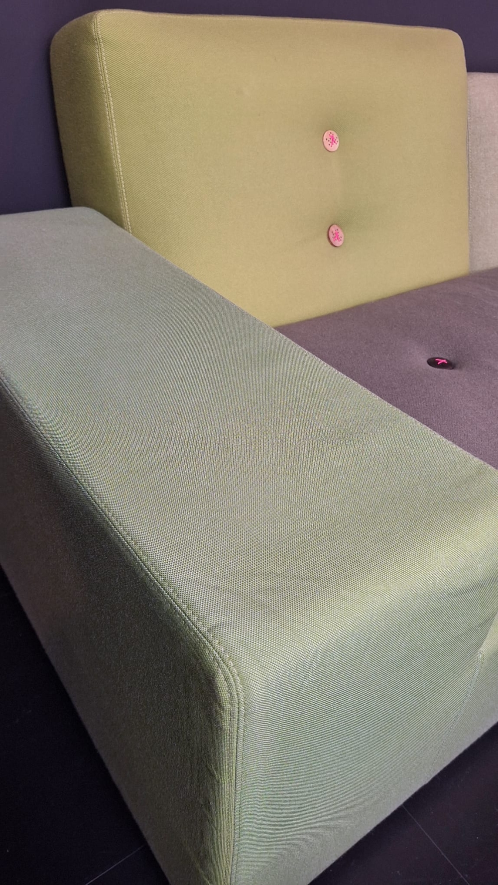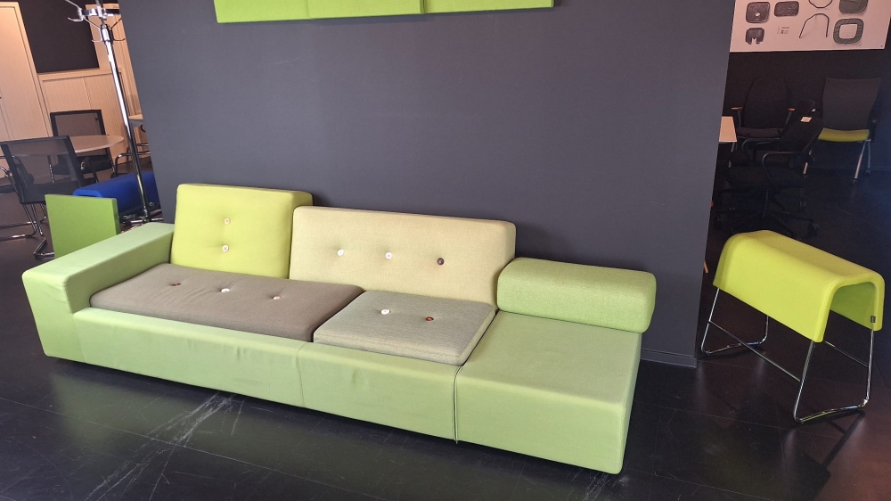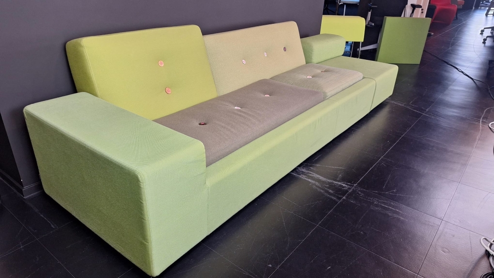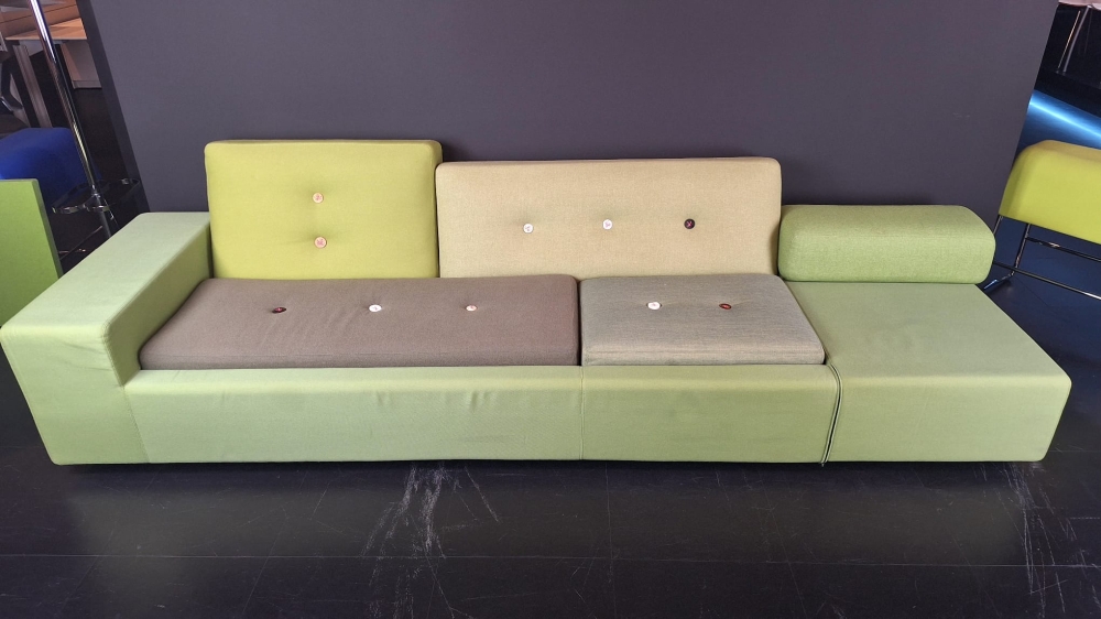 Hella Jongerius gaf de sofa de naam “Polder”. Daarmee verwijst de Nederlandse ontwerpster naar het land dat van de zee werd gewonnen door de aanleg van dijken en kanalen. De asymmetrische sofa doet namelijk denken aan een polderlandschap. De gestoffeerde elementen zijn bekleed met verschillende stoffen in zes op elkaar afgestemde kleurschakeringen. Het effect is aanvankelijk irritant. Is er iets fout gelopen bij de bekleding? Zijn sommige kleuren verbleekt? Is de sofa nieuw of tweedehands? Jongerius over dit samenspel van kleuren en texturen: “Er komt pas iets interessants tot stand wanneer ik erin slaag om verschillende lagen van ideeën, verhalen, materiaaleigenschappen, processen, details, schoonheid, tactiele ervaringen en inconsistenties te combineren.”