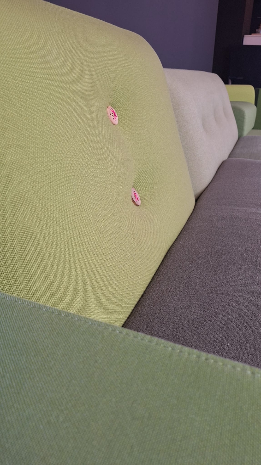 Ook de sierknopen op de kussens kaderen in deze context. Ze zijn vervaardigd uit exotische, natuurlijke materialen, zoals waterbuffelhoorn, olijf- en bamboehout of parelmoer en vertonen verschillende gaten die in een schijnbaar willekeurig patroon werden geboord. De knopen, die met hightechgaren in een brede kruissteek op de overtrekken aangebracht worden, geven de sofa een kenmerkend, ambachtelijke accent.